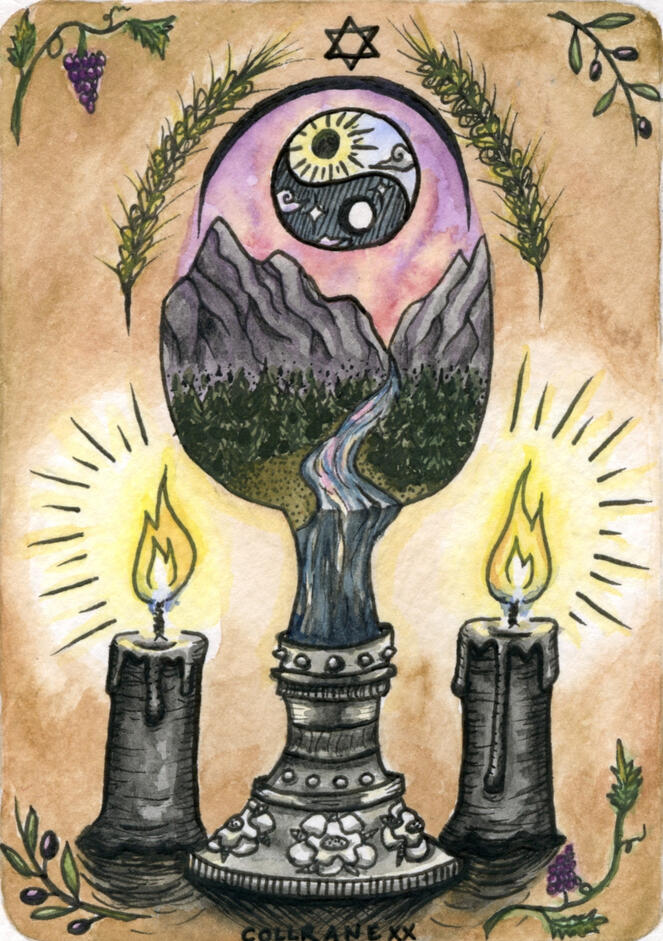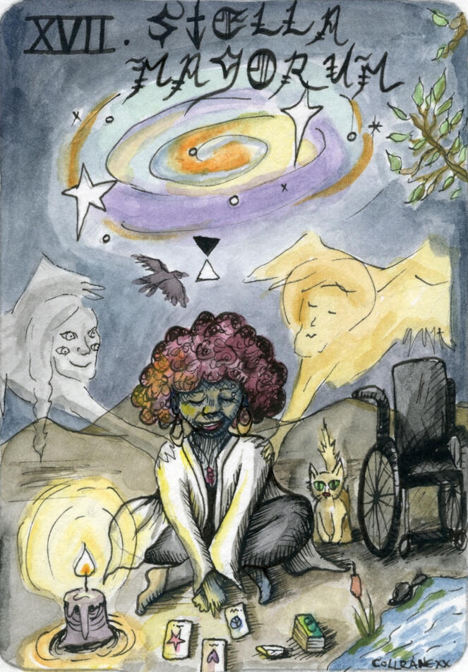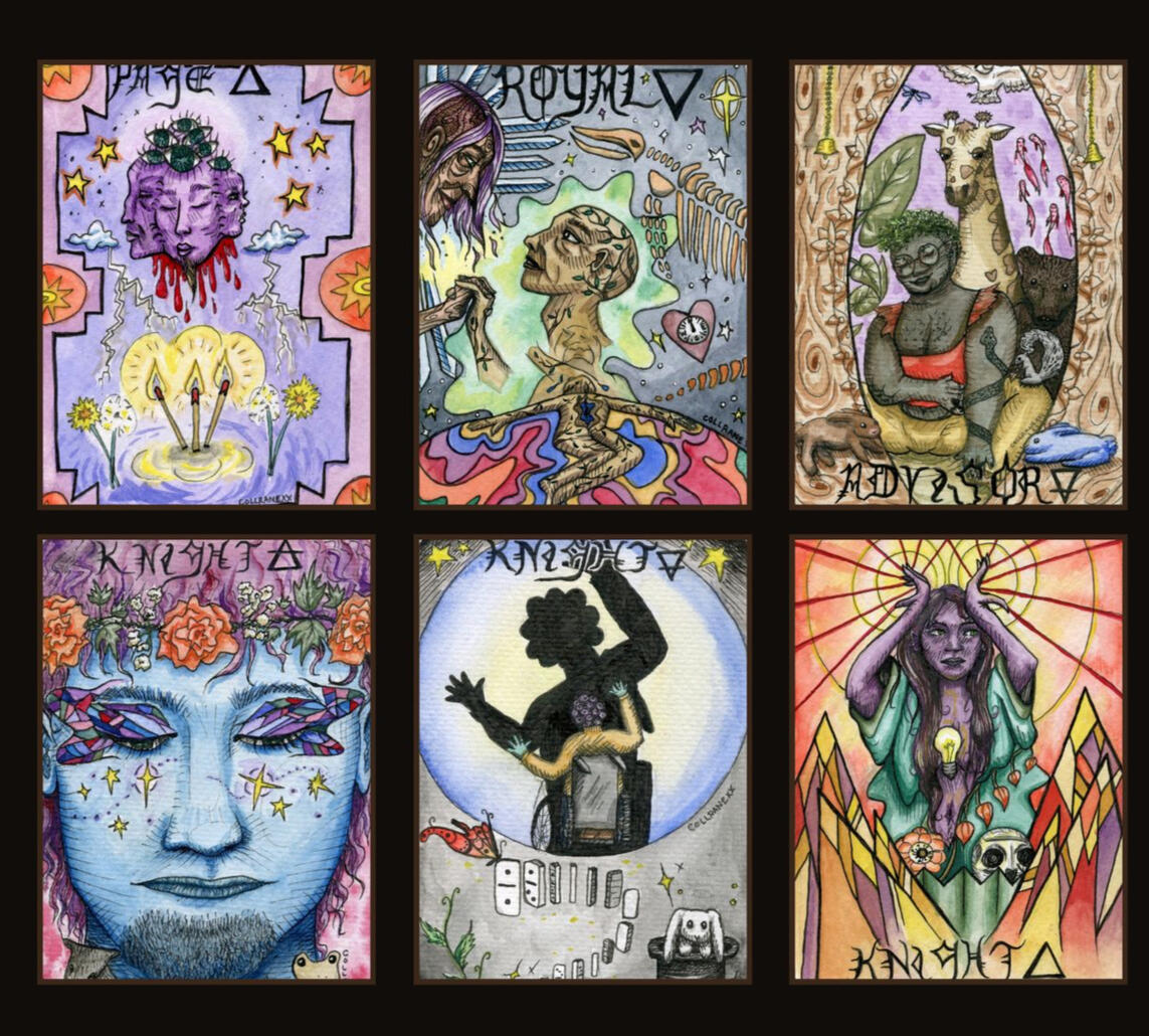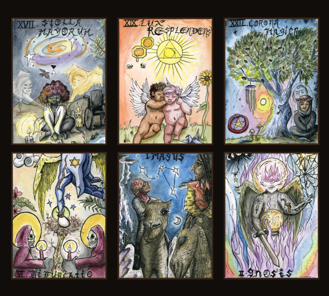This project uses the 22 major arcana and 16 elemental court cards to form a 38-card signifier deck, which allows us to meditate on our identities and spiritual journeying. The cards are accompanied by a 380-page written guidebook, detailing the concepts linked to the cards with academic sources, for deeper tarot study. To accompany the traditional card and book duo, I have added a dice to each set which allows for a reader to intuit the progressional stage using numerology when a court card appears. (This is to remedy the lack of an ace-ten pip card storyline). The court cards are focused on how we perform identity through the 4 traditional earth elements (also used in astrology), and are included to enhance the queer narratives that uniquely juxtapose the included religious scriptures.