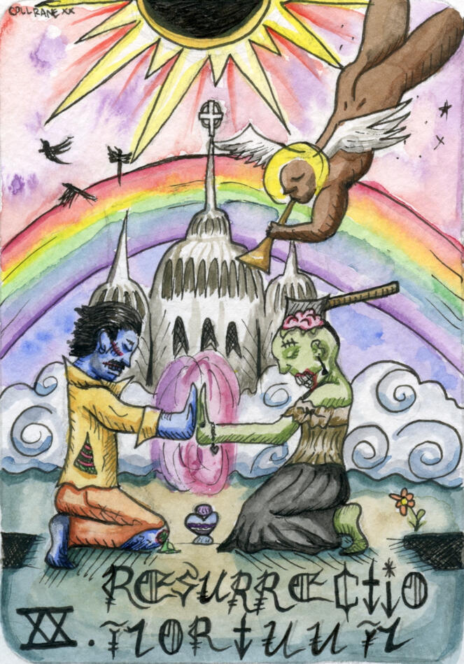 "The ‘resurrection of the dead’, like this card suggests, is a mental concept, where the physical matter is not actually reanimated, but the concepts, spirit, and inspiration they provide are reanimated in the imagination of the human psyche and the social spirit of the people. We see what’s died, literally or metaphorically, in a new way. I see this as a metaphorical raising of the dead, and more of a reanimation of what the dead’s lives represented. This can mean even reanimating or giving new life to aspects of ourselves we had forgotten or needed to cleanse and make new from a period of ‘death’ or transformation.